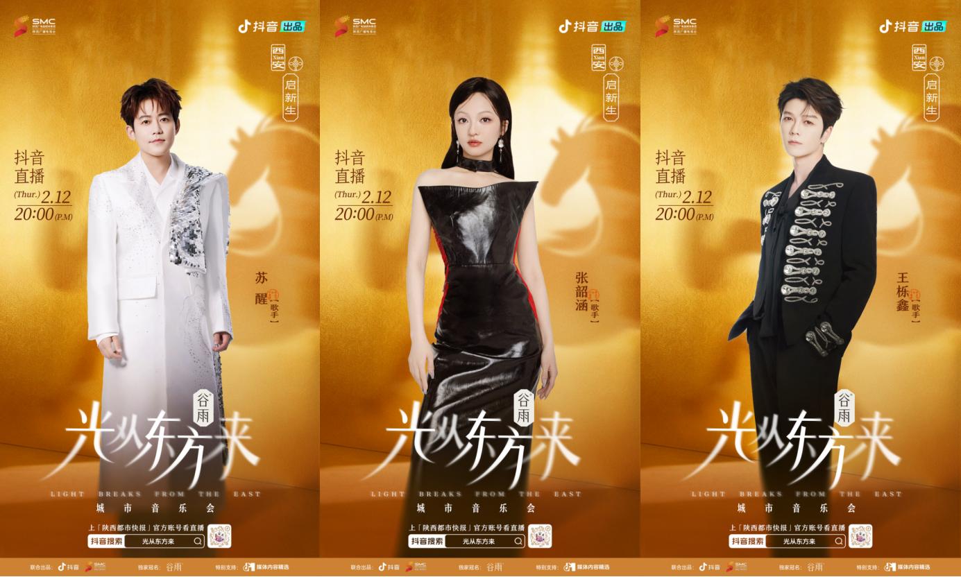 “光从东方来・启新生” 城市音乐会即将启幕,与张韶涵、苏醒、王栎鑫、刘维、王晰、赖美云以及陕西院团、抖音达人们共赴追光之约,在古都西安的光影流转中,听歌、起舞、赏非遗、品年味。2026年2月12日晚 20点,锁定 @陕西都市快报 、@陕西卫视 抖音官方账号及 @光从东方来 节目抖音号,我们不见不散。