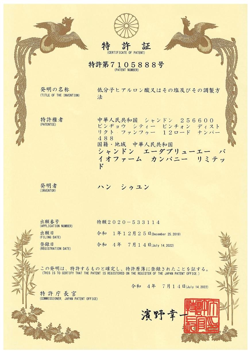 近日,山东安华生物医药股份有限公司《低分子透明质酸或其盐及其制备方法》专利正式获日本特许厅批准并颁发证书。