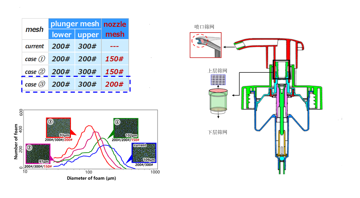 重新梳理泡沫的形成路径后,包装容器团队发现喷口处或许可以增加一层筛网,将已经成型的泡沫再一次切割。捕捉到灵感后,团队迅速开展实验,验证猜想。团队设置了四组对照泵头,分别测试泡沫直径。数据显示,泵头内部上下层筛网目数保持300目和200目不变,喷口处加设200目的筛网后,形成的泡沫直径为93μm,最接近理想中的泡沫形态,90μm级的泡沫已经可以达到与气雾罐类产品喷射的泡沫同等的效果。
