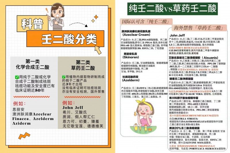 第二类:草药制壬二酸,它是用植物提取物制作成假王二酸,是近3年才出现的,也是国外禁售的所以它安全性是没有保障,像John Jeff、希川等要谨慎选择。并且草药制壬二酸是没有祛痘祛斑功能,用在脸上会导致皮肤有烂脸风险!